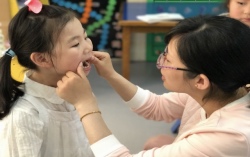 牙医妈妈拿着牙模型,来到了孩子们的中间,为孩子们展开了生动有趣的爱牙护牙知识活动。结合模型,牙医妈妈为孩子们专业地讲解了什么是乳牙、什么是恒牙?并通过生动的PPT课件向孩子们展示了正确的刷牙方法和一系列简单的护牙小知识,如饭后漱口,用正确的方法刷牙,少吃甜食,多吃粗粮等等,这样才能让牙齿保持洁白干净,抵抗龋齿的侵害。然后牙医妈妈还为全班幼儿做了口腔的检查,并做了记录表发放给幼儿,让幼儿的家长可以重视孩子的口腔健康。最后在牙医妈妈的带领下,孩子们进行了《我帮巧虎来刷牙》游戏活动,感受了刷牙的乐趣。此外,医生妈妈还设计了知识抢答环节,小朋友纷纷举手,将学到的护牙知识与同伴一起分享,还得到了医生妈妈送得小礼物,活动气氛推向了高潮。