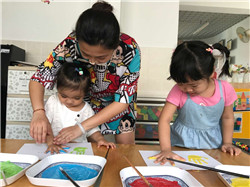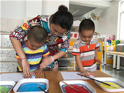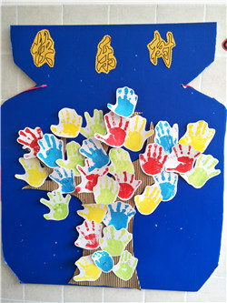 日前,我们还特意设计、组织了一次美术活动《快乐树》,让孩子用自己的小手来印树叶,这活动大大吸引了孩子的兴趣,孩子们都非常好奇、也非常喜欢,都能积极参与到其中,把自己的小手印到白纸上,然后老师又帮他们把“小手树叶”剪了下来,贴到了树上,并取名“快乐树”,孩子们看着自己制作出的“快乐树”,高兴地拍起了手。而且,早上来、晚上走时总要拉着爸爸妈妈的手去看自己印的小手……