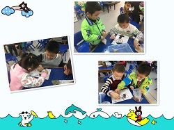 孩子们挑选自己喜欢的种子合作作画。一位小朋友先用记号笔打底稿,然后另一位小朋友用小毛笔涂上树胶,随后两人配合着摆上不同的种子,不一会就贴出了一幅幅自己设计的的图画。有用黄豆、大米粘贴成的蝴蝶,有用绿豆粘贴成的小小手,有用黄豆粘贴成的太阳花等,孩子们尝试着用不同颜色和大小的种子区分细节之处,非常有自己的想法。