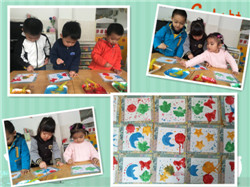 多种多样的小模具,跳进五彩的盘子里,沾上漂亮的颜色,尽情地跳跃,在孩子们快乐的游戏中,漂亮的花布诞生了。瞧,多美呀!孩子们不尽拍手欢呼!