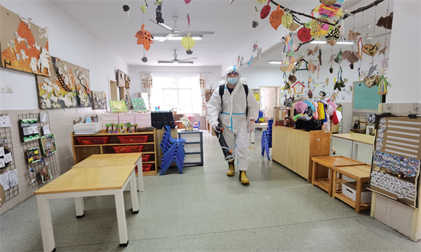本次消毒严格按照新冠肺炎病毒防控工作要求,全园性立体大清洁,来自消防支队的专业消杀人员身穿防护服,使用专业的消毒设备,有条不紊地对幼儿园的教室、各功能室、食堂、办公室、卫生间、楼道以及走廊等各个角落进行了彻底的、全方位的喷洒消毒。同时,班级老师也对活动室的桌椅、窗台、门及门框等室内设施进行擦拭消毒,幼儿的被褥全部进行晾晒,对各楼层、教室、走廊、厕所,幼儿活动场地,玩具等彻底清理,做到不留死角,不留盲区。
