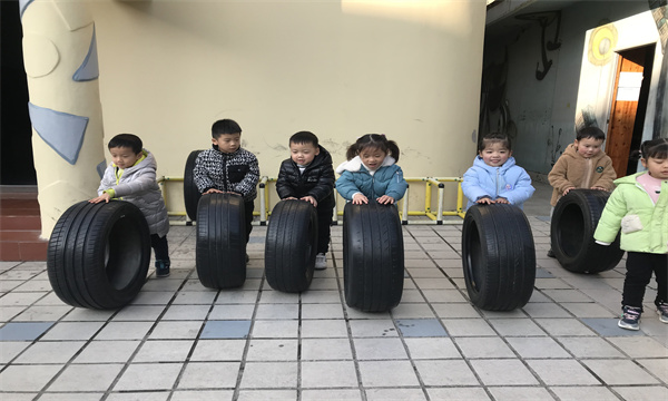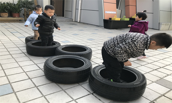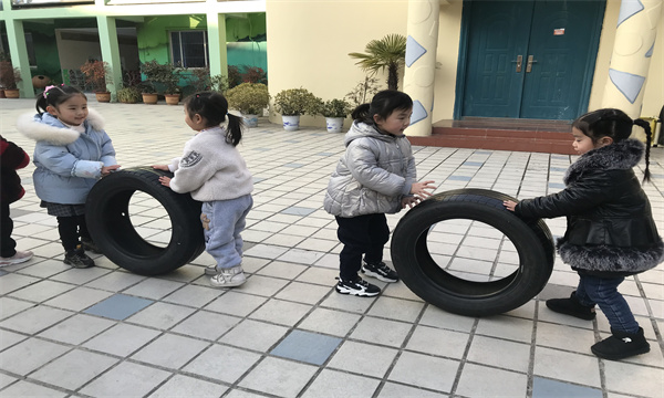 冬日虽然寒冷,但冬日里的阳光格外明媚。1月11日这一天,天气格外晴朗,天宁区实验幼儿园小三班的孩子们来到户外,又玩起了他们最喜欢的轮胎。经过多次游戏挑战,孩子们对轮胎已非常熟悉,今天,他们就来挑战花样玩轮胎。