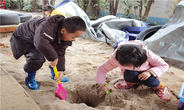 整个游戏中孩子们始终处于主动学习、探索的状态,他们互相合作、互相交流,在堆沙、挖道、筑墙中体验沙的松软、了解沙的可塑性,笑声和欢呼声不绝于耳,成为了幼儿园里一道靓丽的风景线。