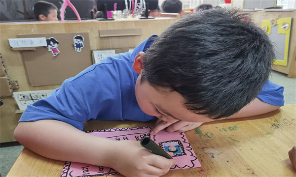 活动中,孩子们首先用各种线条和图案装饰自己的名字和明信片,画出自己的爱好和对班里好朋友的祝福等。最后孩子们还通过一个小游戏,亲手把明信片送给了好朋友们!