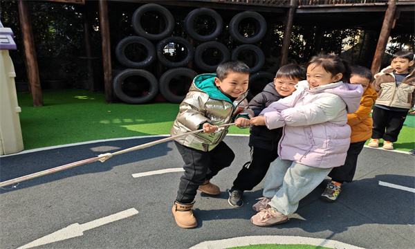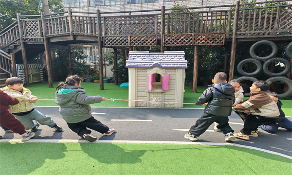 场地上,孩子们小脸被阳光晒得红扑扑的。随着老师一声令下,拔河比赛正式开始!小选手们紧紧攥住绳子,身体向后倾斜,双脚稳稳扎在地面上,使出浑身力气向自己的方向拉扯。有的孩子眉头紧锁、咬紧牙关,有的则涨红了小脸,眼神里满是不服输的韧劲。旁边的小伙伴们也自发组成啦啦队,挥舞着小手为队友加油鼓劲,稚嫩的呐喊声回荡在幼儿园里。